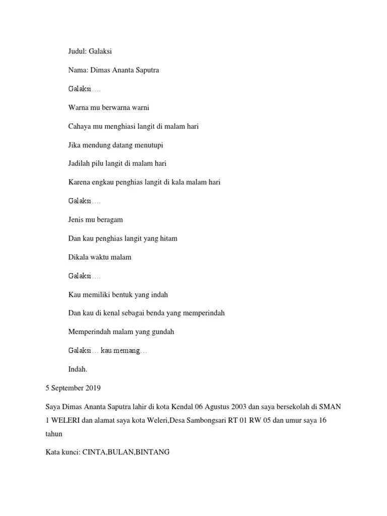 "antologi 100 puisi alam sekitar kasa". Mereka membangun sungai pada kepalanya, kata seseorang, agar hanyut kalimatkalimat dalam fikirannya menuju bendunganbendungan yang Tumbuh di dua tepi sungai. Fnspj baca puisi tingkat sma/smkmewakili smk negeri 1 sampang. Berikut adalah lima puisi bertema sungai paling mengharukan.