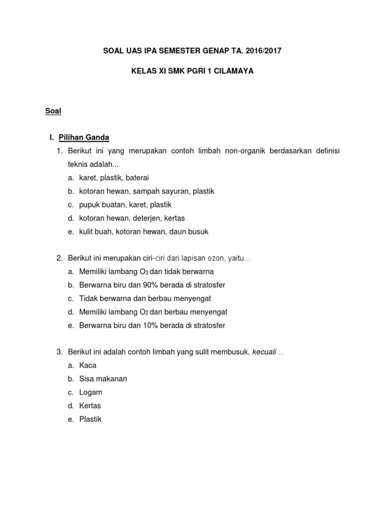 Di bawah ini yang termasuk . Organisme yang sering mencemarkan air adalah. Limbah yang mengandung bahan berbahaya dan 8. Pengolohan limbah dengan melakukan penyaringan termasuk pengolahan secara. Soal ulangan semester mata pelajaran ipa kelas xi pemasaran 2 1.